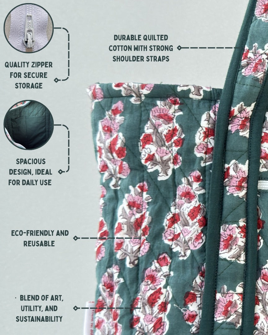 Graceful Emerald Quilted Tote Bag | Made in Jaipur