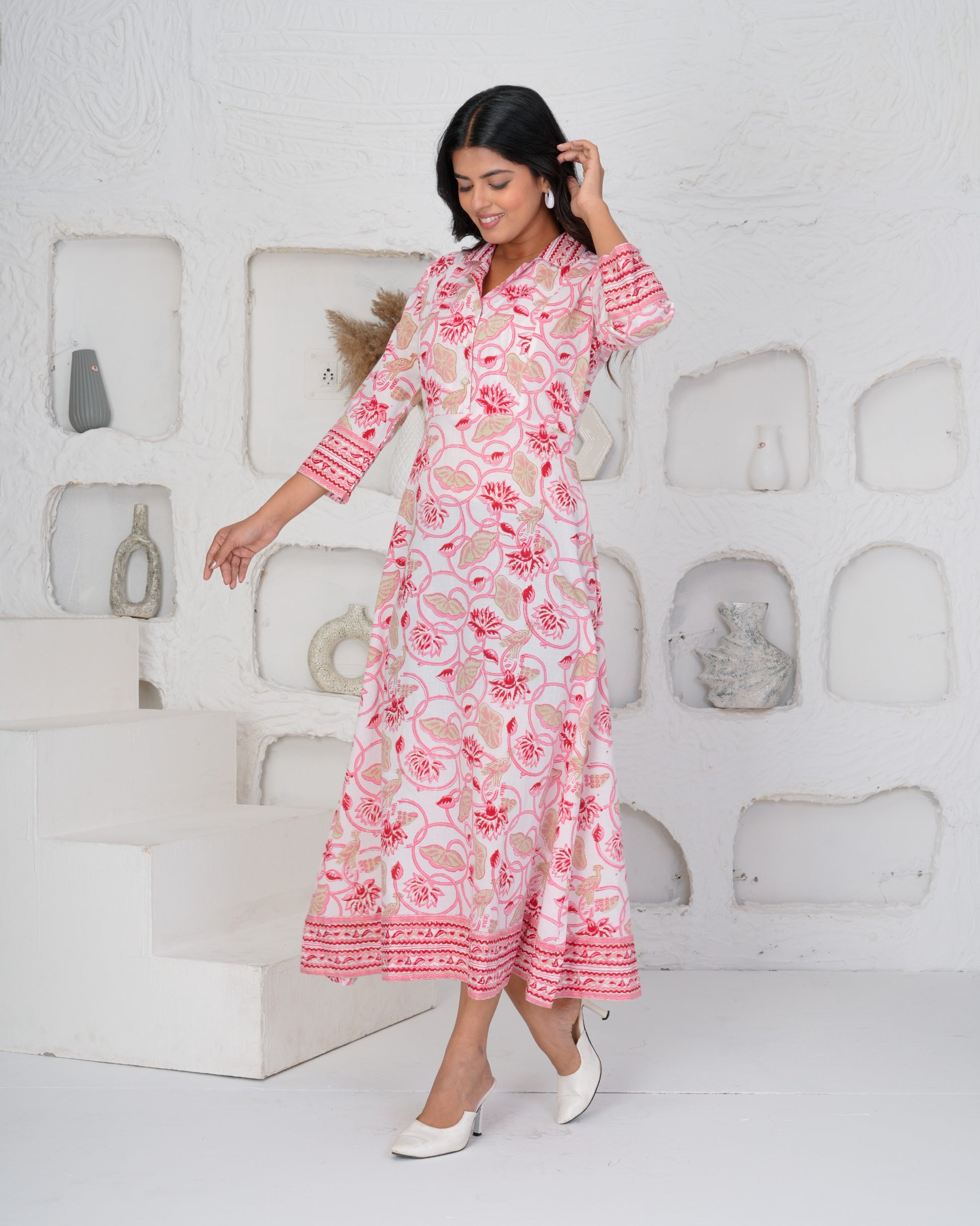Crafted from 100% pure cotton, this dress features authentic handblock prints created by skilled artisans, making each piece a wearable work of art. Thoughtfully designed with a flattering silhouette and functional pockets, it blends utility with style—perfect for a relaxed day out, casual gatherings, or simply embracing the beauty of slow fashion.