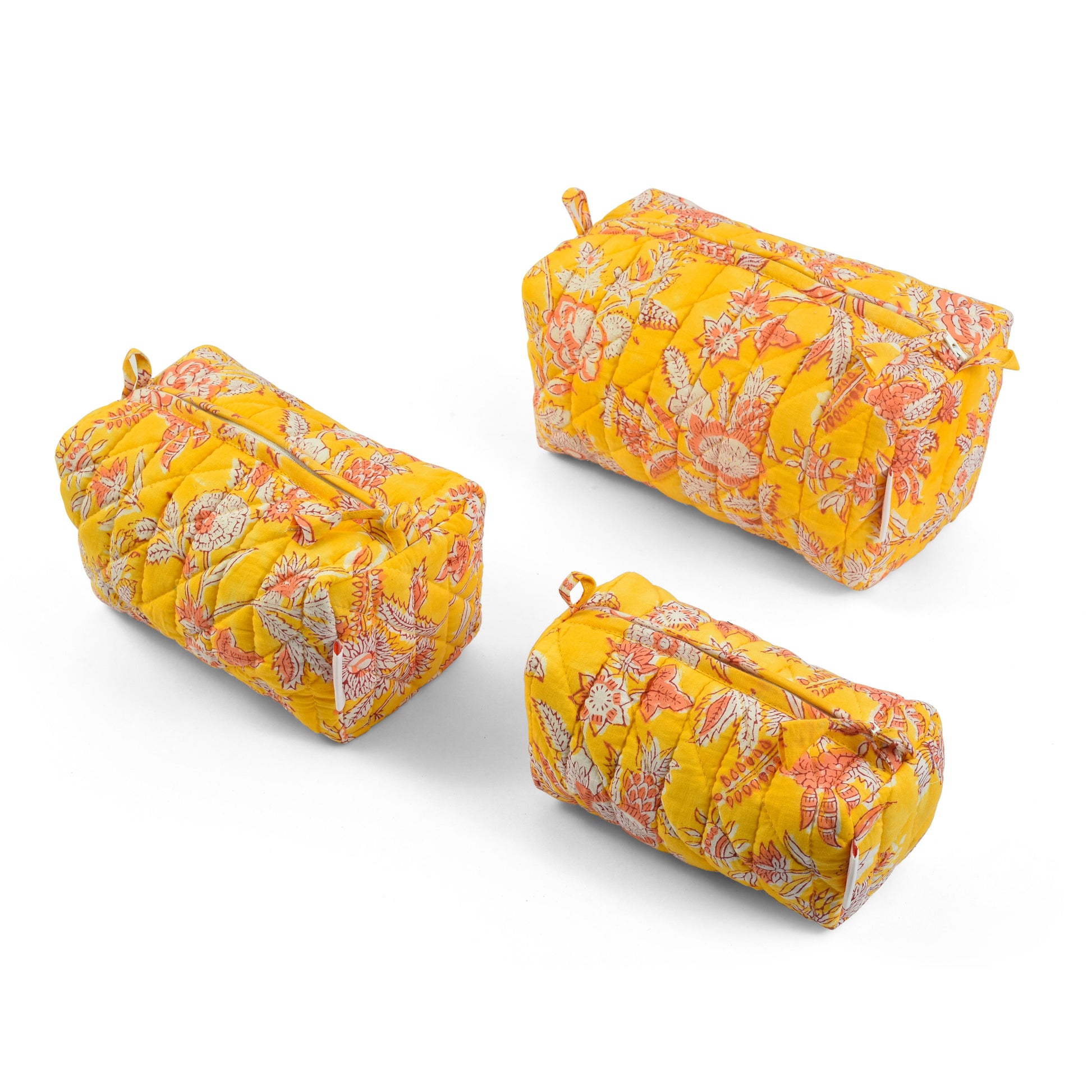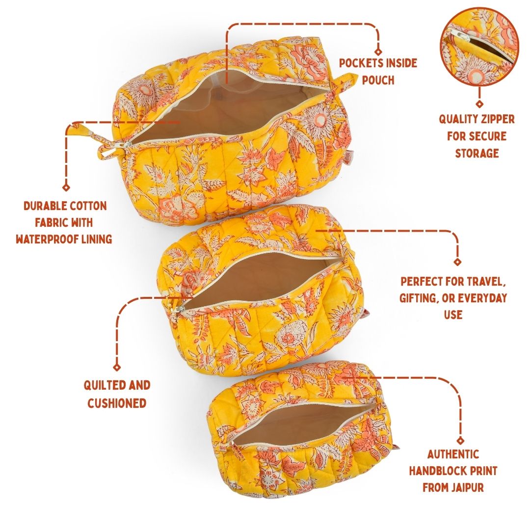 Radiant Yellow - Set of 3 Handblock Printed Quilted Pouches | Crafted in Jaipur